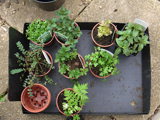 Out in the wilds of the ornamental garden, which I'm hoping to get in order later this year or next at the worst, are rosemary, fennel, angelica, sweet woodruff, hyssop, valerian, vervain, lady's mantle, southernwood and wormwood. This year the annual herbs will be occupying spots in the herb beds that might later be taken by vertical cordons of cherry and plum, and maybe some autumn fruiting raspberries. Decisions on extra herbs vs fruit will be taken later in the year!
